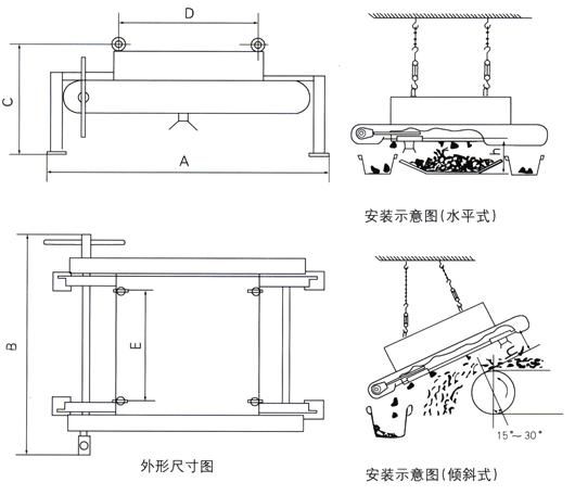 | 型號\參數(shù)\項目 | 適應(yīng)帶寬 mm | 額定吊高 h=mm | 物料厚度 ≤mm | 磁場強度 ≥mT | 適應(yīng)帶速 ≤m/s | 重量 kg | 外形尺寸 A×B×C | 懸掛尺寸 D×E |